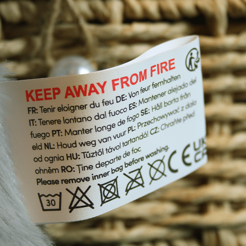 TÄMÄ VEHNÄTUOTE ON VALMISTETTU STANDARDIN B.S.8433 MUKAISESTI MAKSIMAALISEN TURVALLISUUDEN VARMISTAMISEKSI. TURVALLISUUTESI VARMISTAMISEKSI LUE SEURAAVAT OHJEET. LÄMMITYSOHJEET: Tämä tuote sisältää irrotettavan vehnäpussin. Tämä on ainoa lämmitettävä osa. Älä lämmitä pehmolelua. Tämän prosessin saa suorittaa aikuinen.